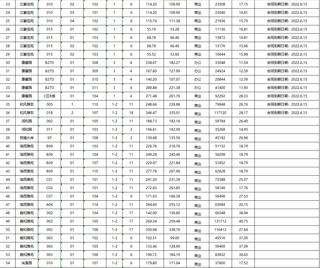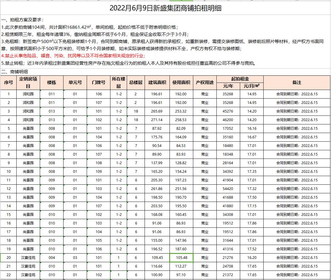 2.各小區(qū)外圍商鋪104間:潤和園6間、尚景園24間、漢襄佳苑10間、康馨園15間、和風雅致11間、湖西雅苑8間、嘉和雅苑6間、宜居嘉園10間、澤惠嘉園7間、玉潭佳苑2間、天瑞華府1間、楓情水岸1間、紫荊園2間、玉棠苑1間。面積分別約為數(shù)十至三百余平米不等,租期均為三年。