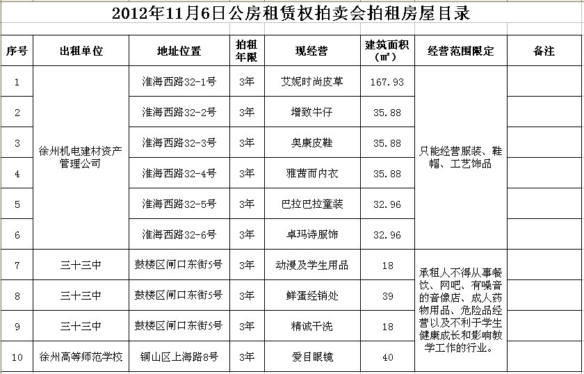 我公司受徐州市市級機關事務管理局、徐州產(chǎn)權交易所委托,定于2012年11月6日10時在中山南路55號拍賣廳公開拍賣以下公有房屋三年期租賃權: