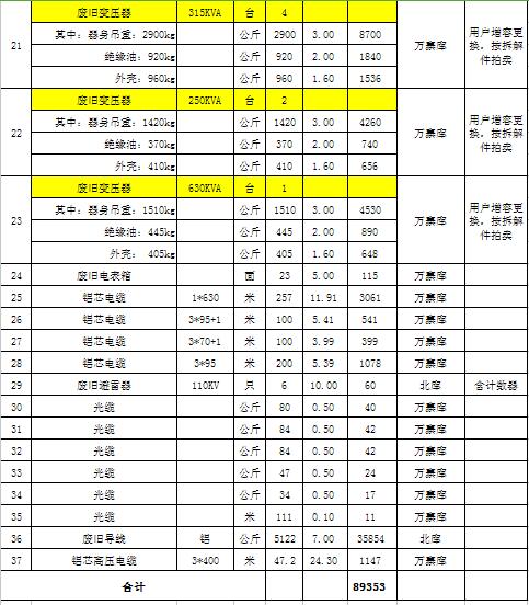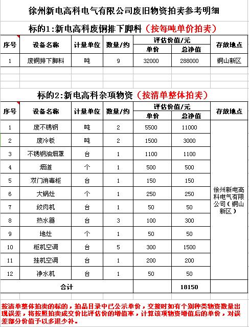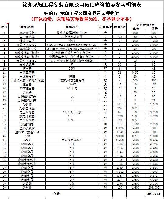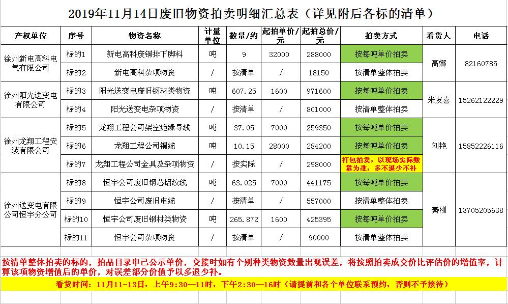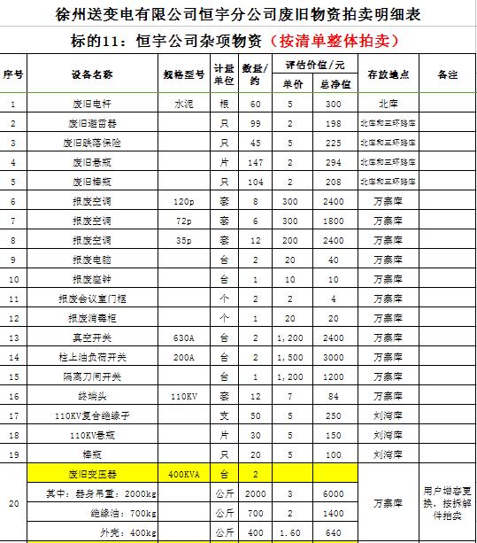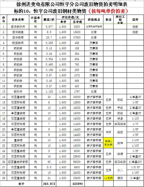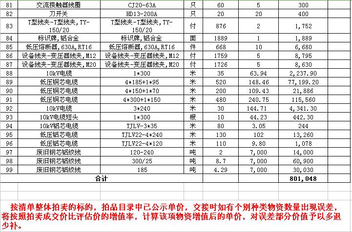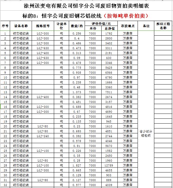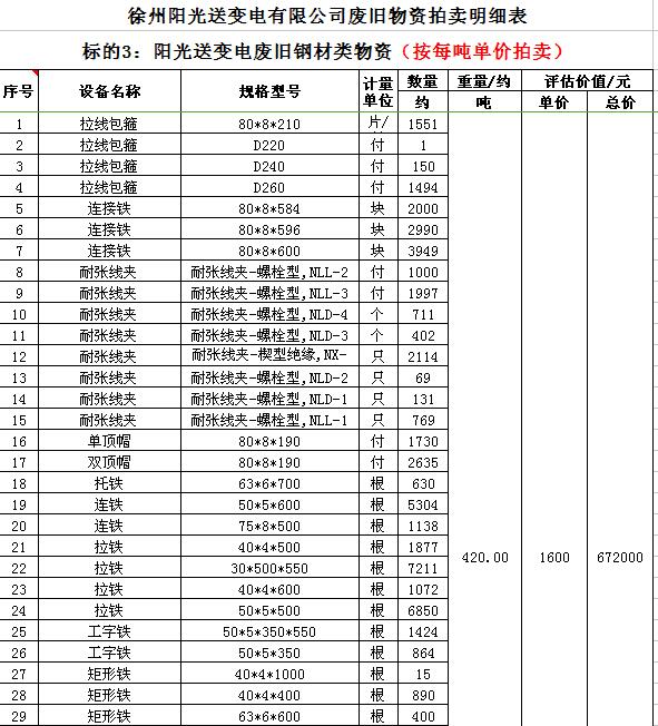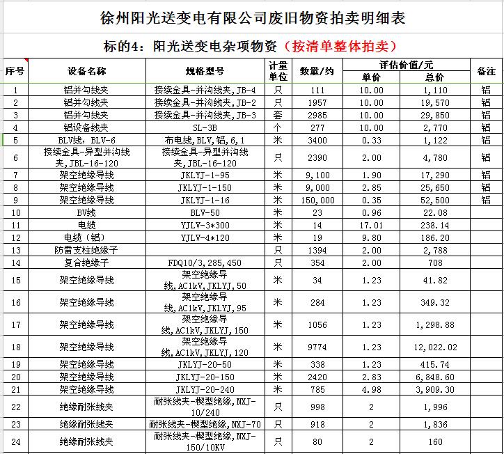 關(guān)注微信公眾號受委托,我公司將通過中國拍賣行業(yè)協(xié)會網(wǎng)絡(luò)拍賣平臺以網(wǎng)絡(luò)競價的方式公開拍賣以下公司廢舊電力物資。主要包含:廢銅排下腳料、廢不銹鋼、辦公設(shè)備等;架空絕緣導線、電纜、金具、角鋼塔、鋼芯鋁絞線、開關(guān)、互感器、變壓器散件等。
