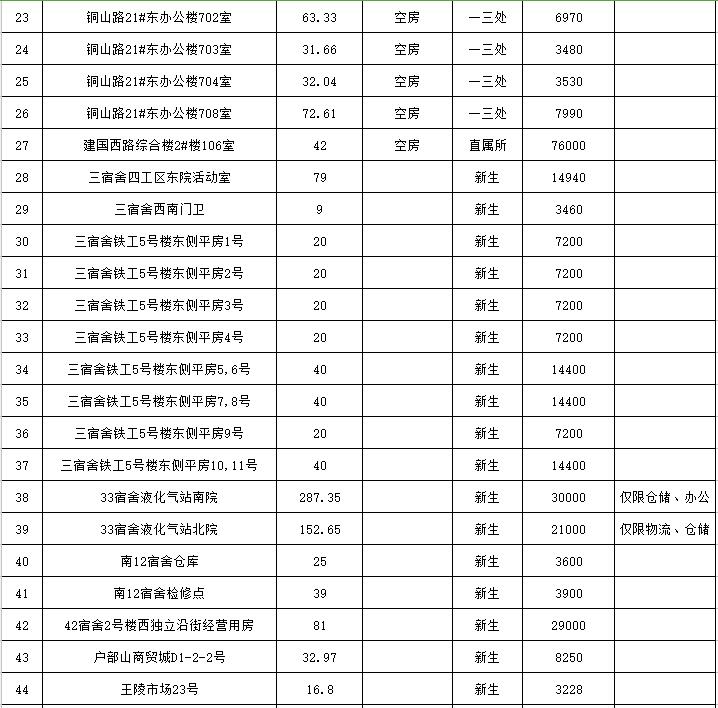 位于銅山路21#辦公房屋15處;位于建國(guó)西路2號(hào)樓辦公房屋5處;位于鐵路3宿舍10處、33宿舍2處、南12宿舍2處、41-42宿舍2處,其他分別位于王陵市場(chǎng)、復(fù)興南路、戶部山商貿(mào)城、皇城大廈、解放路3號(hào)、南門橋綜合樓等地。