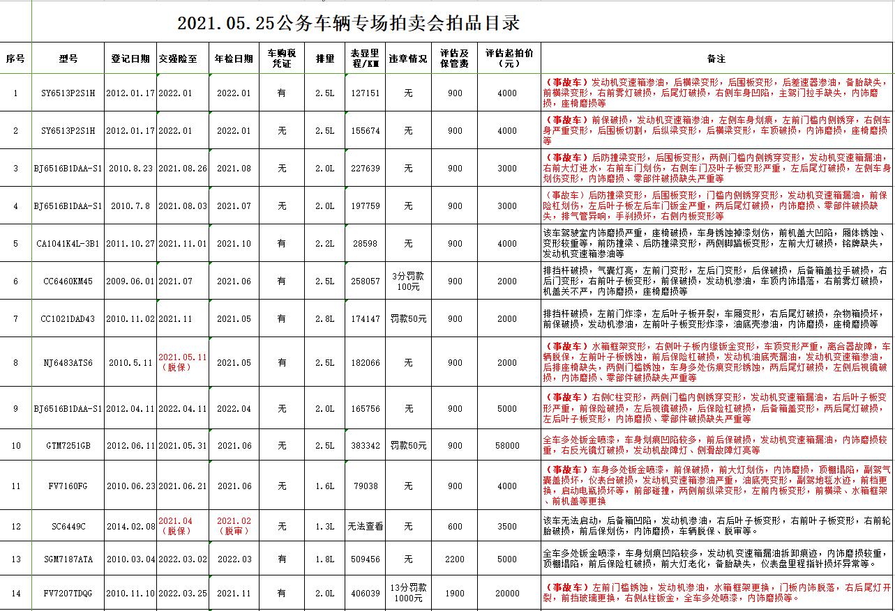受委托,我公司定于2021年5月25日10時(shí)在中拍平臺(tái)通過(guò)網(wǎng)絡(luò)競(jìng)拍方式公開(kāi)拍賣(mài)以下公務(wù)車(chē)輛: